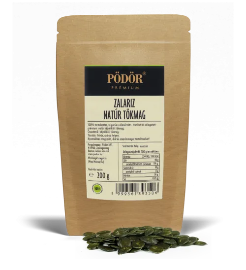 A Pödör Zalariz héjnélküli natúr tökmagja szigorúan ellenőrzött, válogatott és szárított, 100 százalékban természetes és génkezelésmentes.